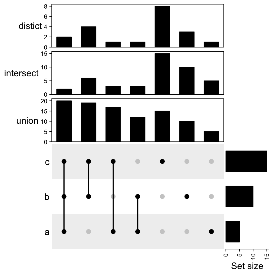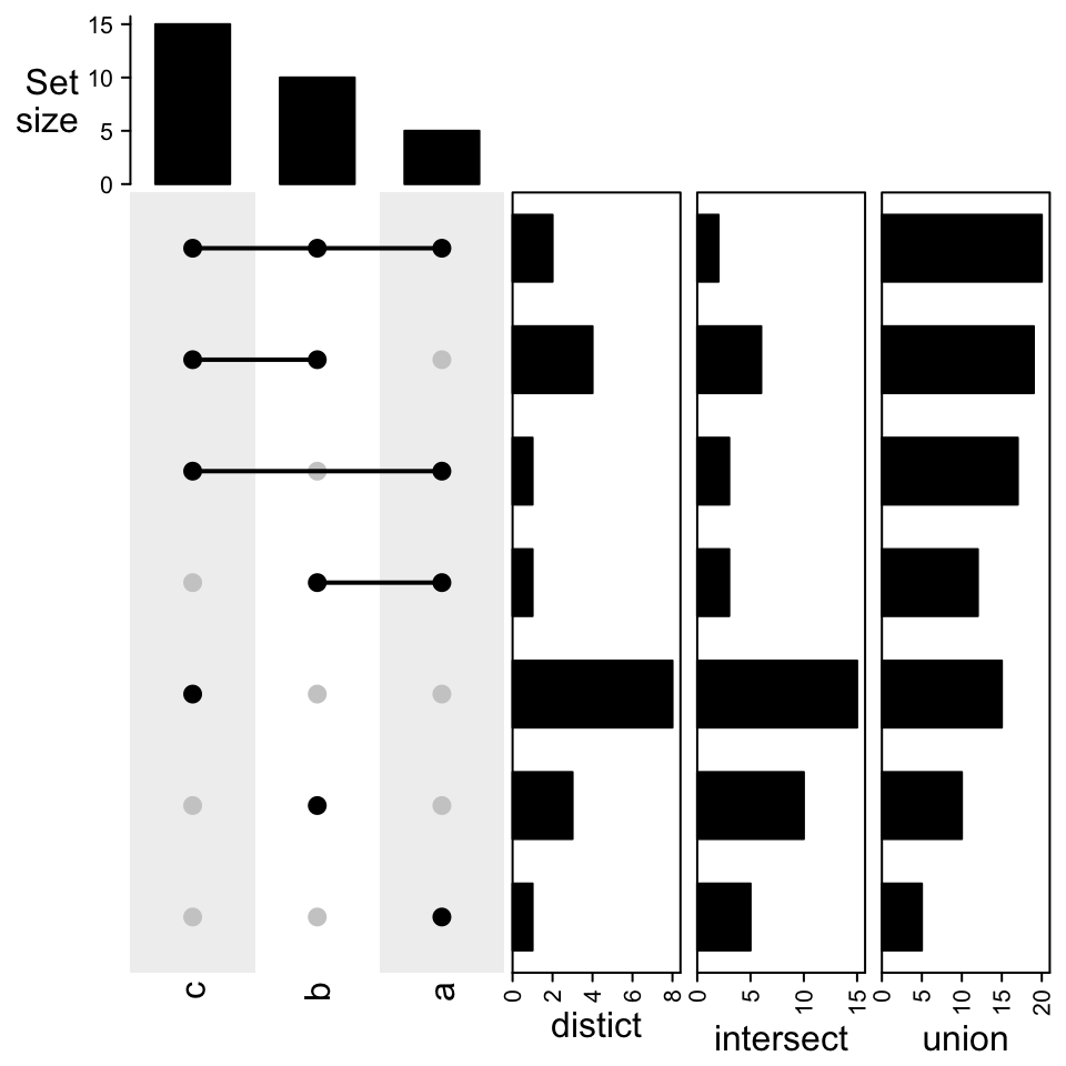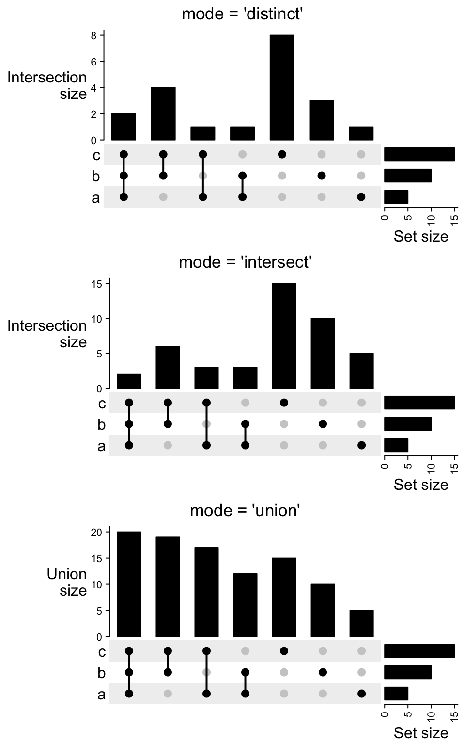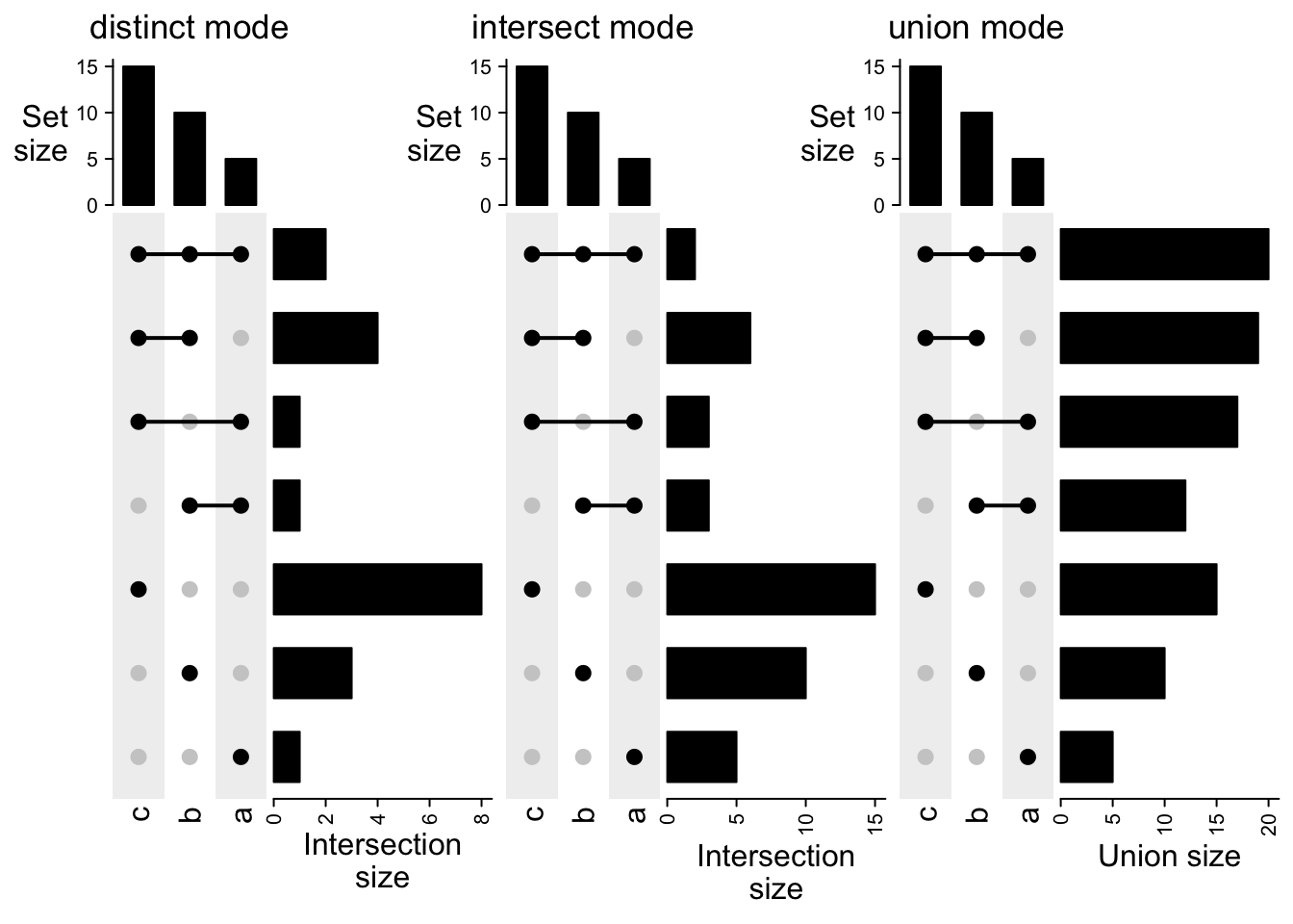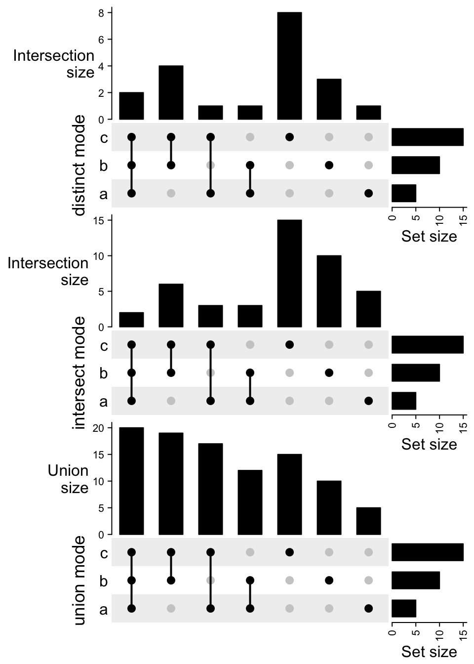 The UpSet plot visualizes the size of each combination set. With the binary code of each combination set, next we need to define how to calculate the size of that combination set. There are three modes:
