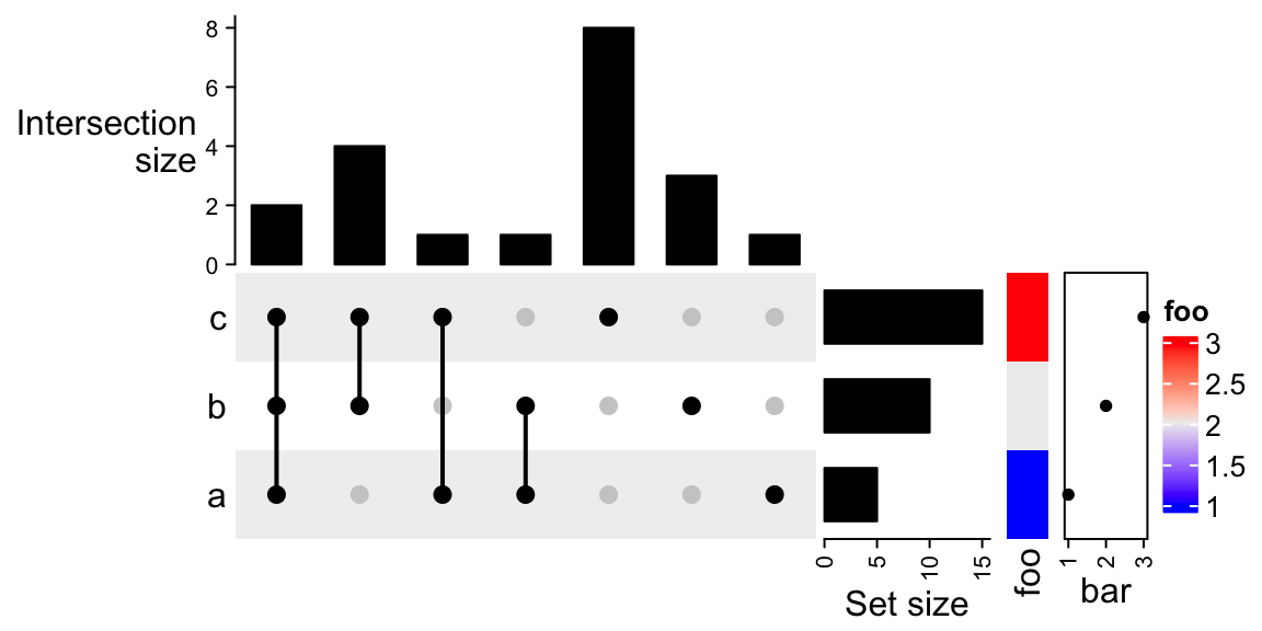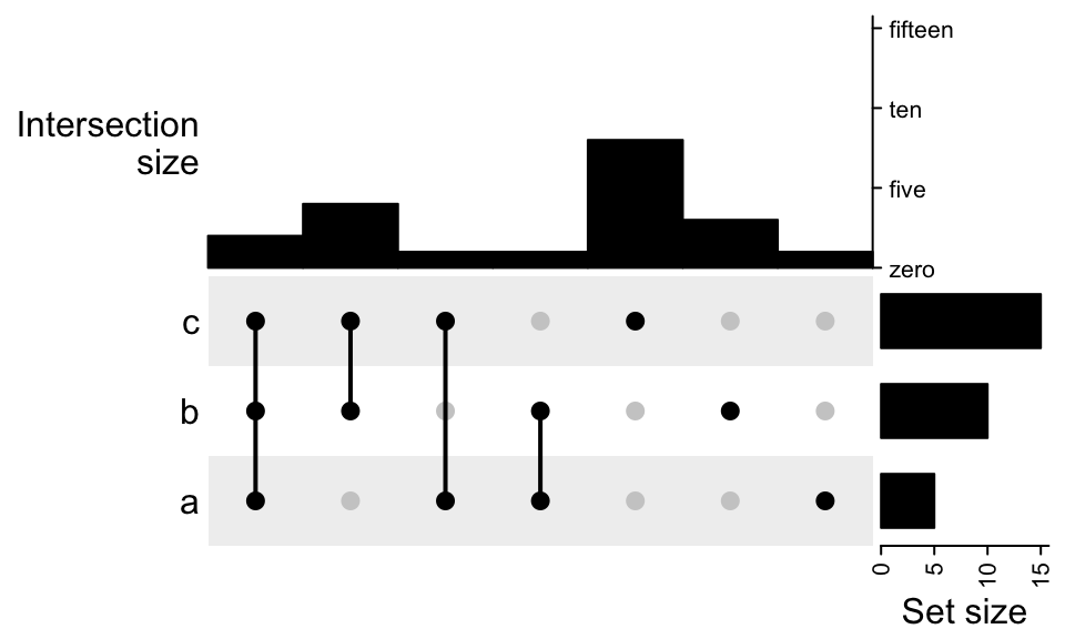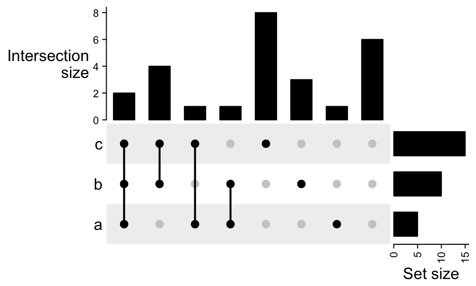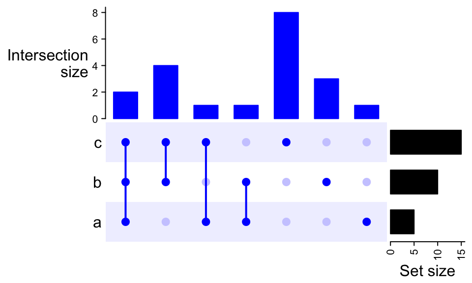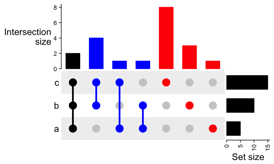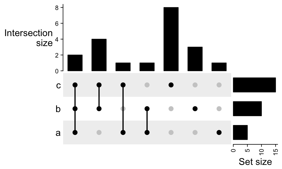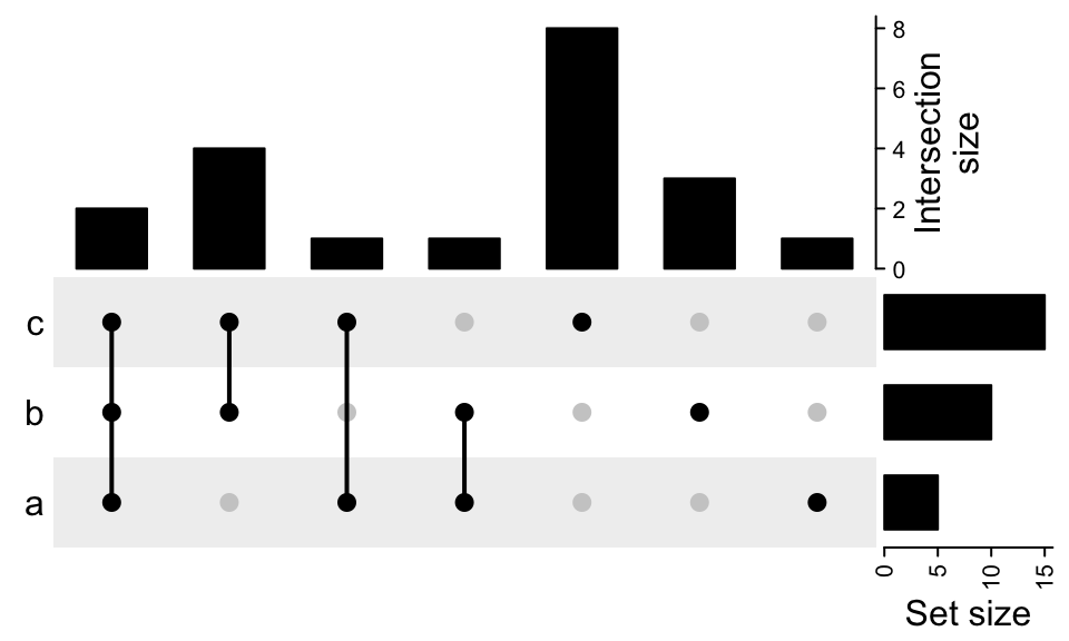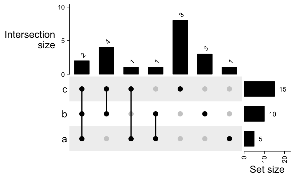 The UpSet plot visualizes the size of each combination set. With the binary code of each combination set, next we need to define how to calculate the size of that combination set. There are three modes: