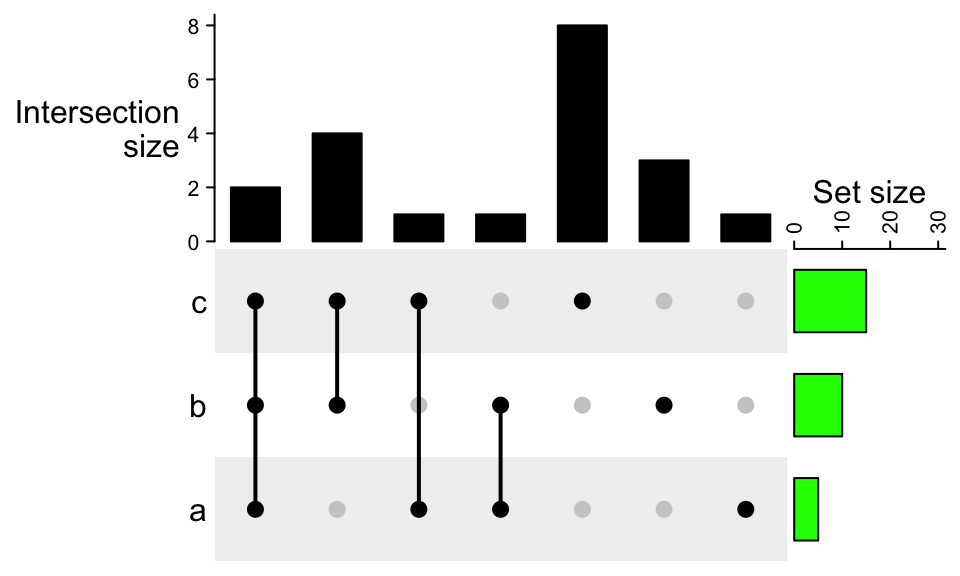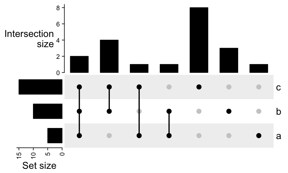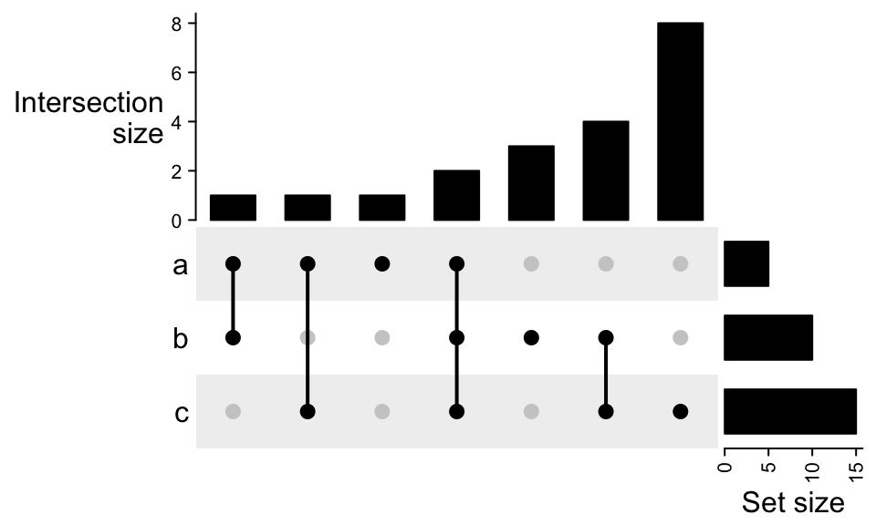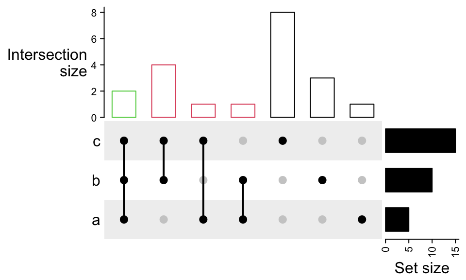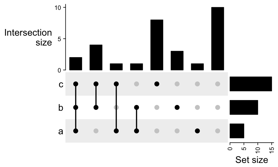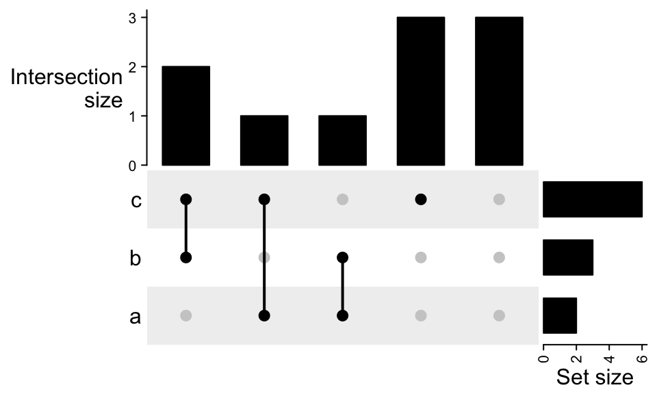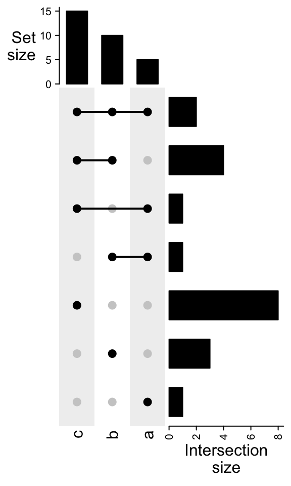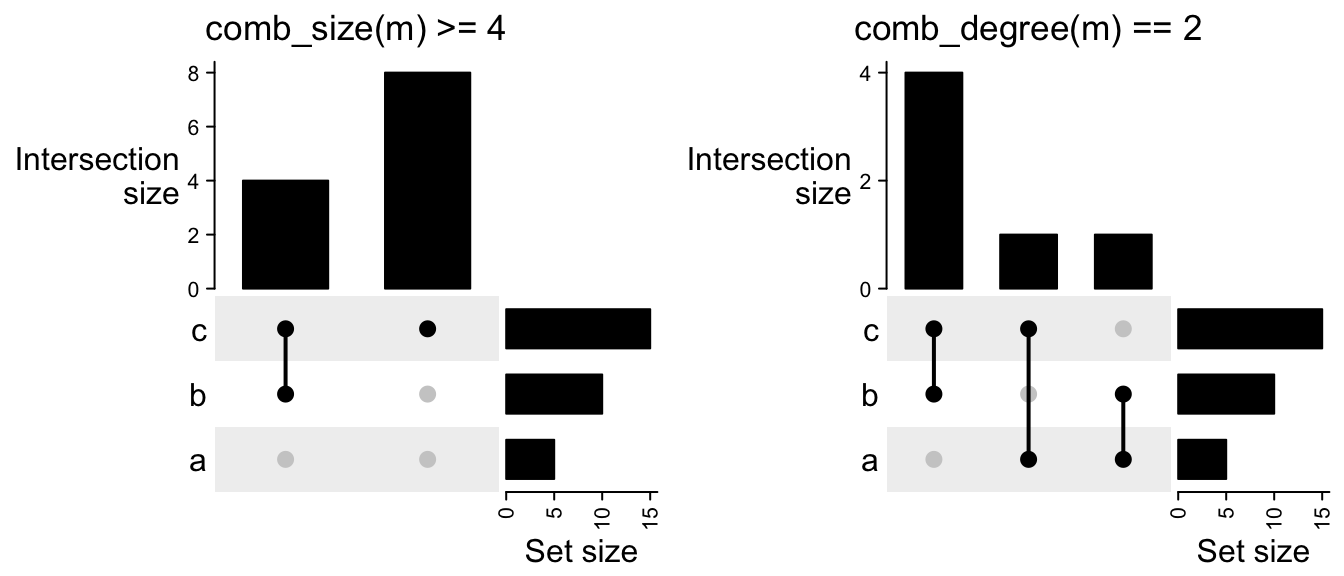 m2 = make_comb_mat(lt, top_n_sets = 2)The subsetting of the sets affects the calculation of the sizes of the combination sets, that is why it needs to be controlled at the combination matrix generation step. The subsetting of combination sets can be directly performed by subsetting the matrix: