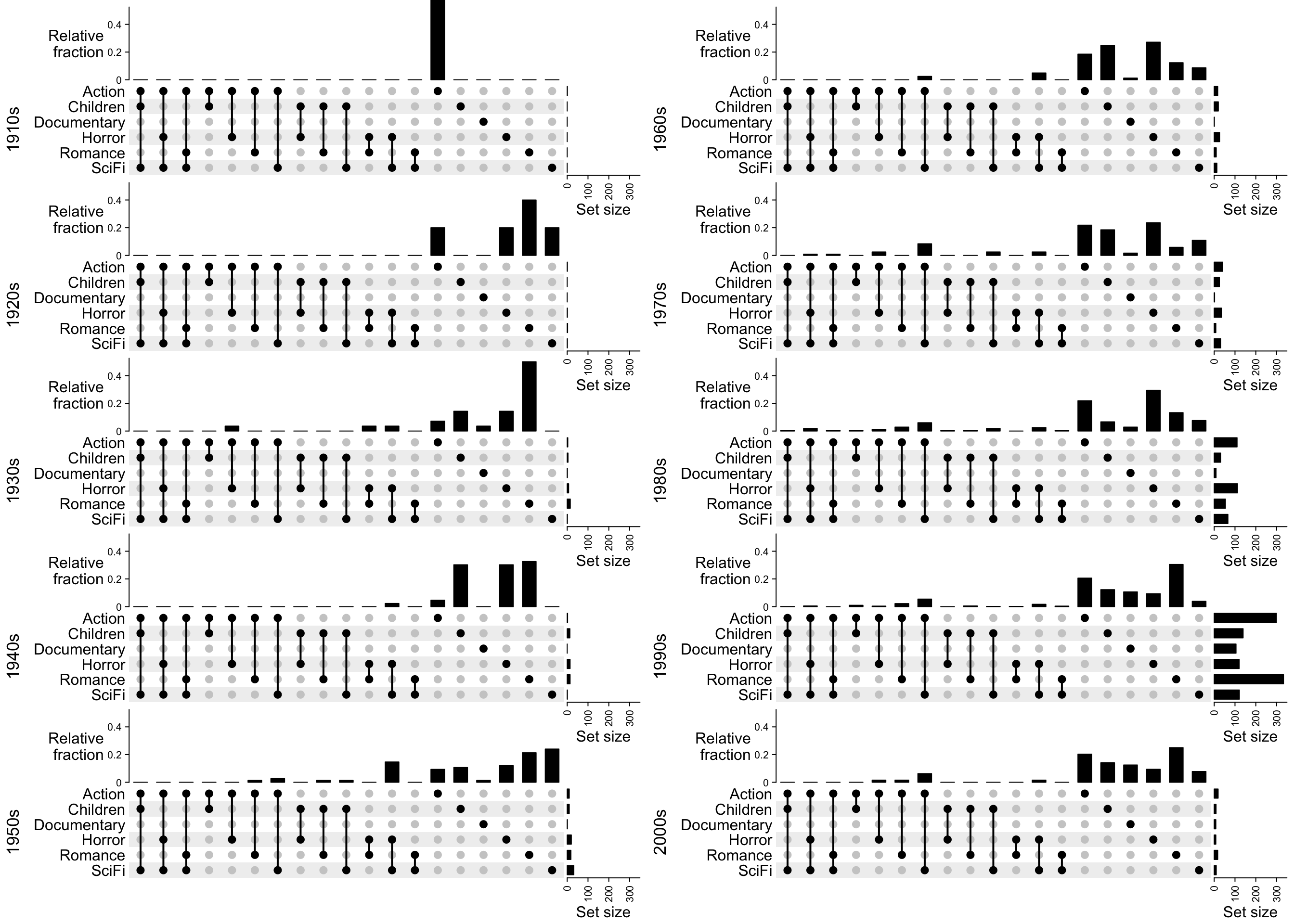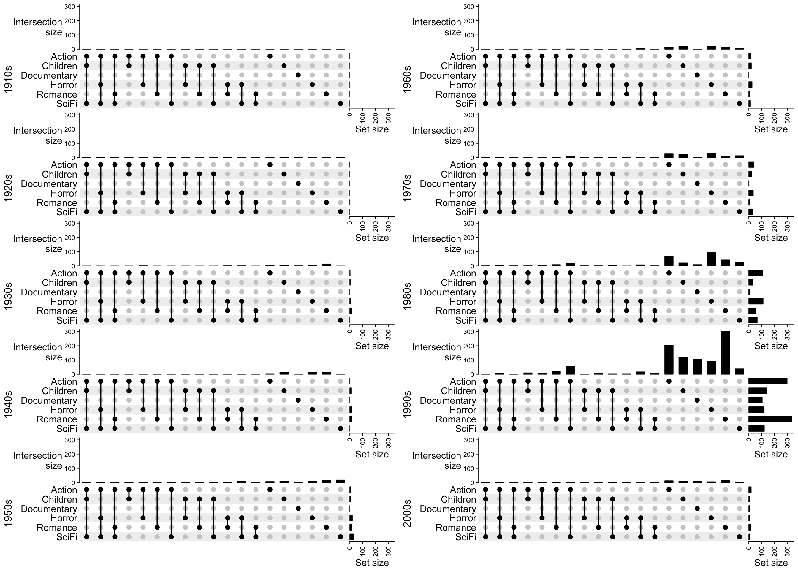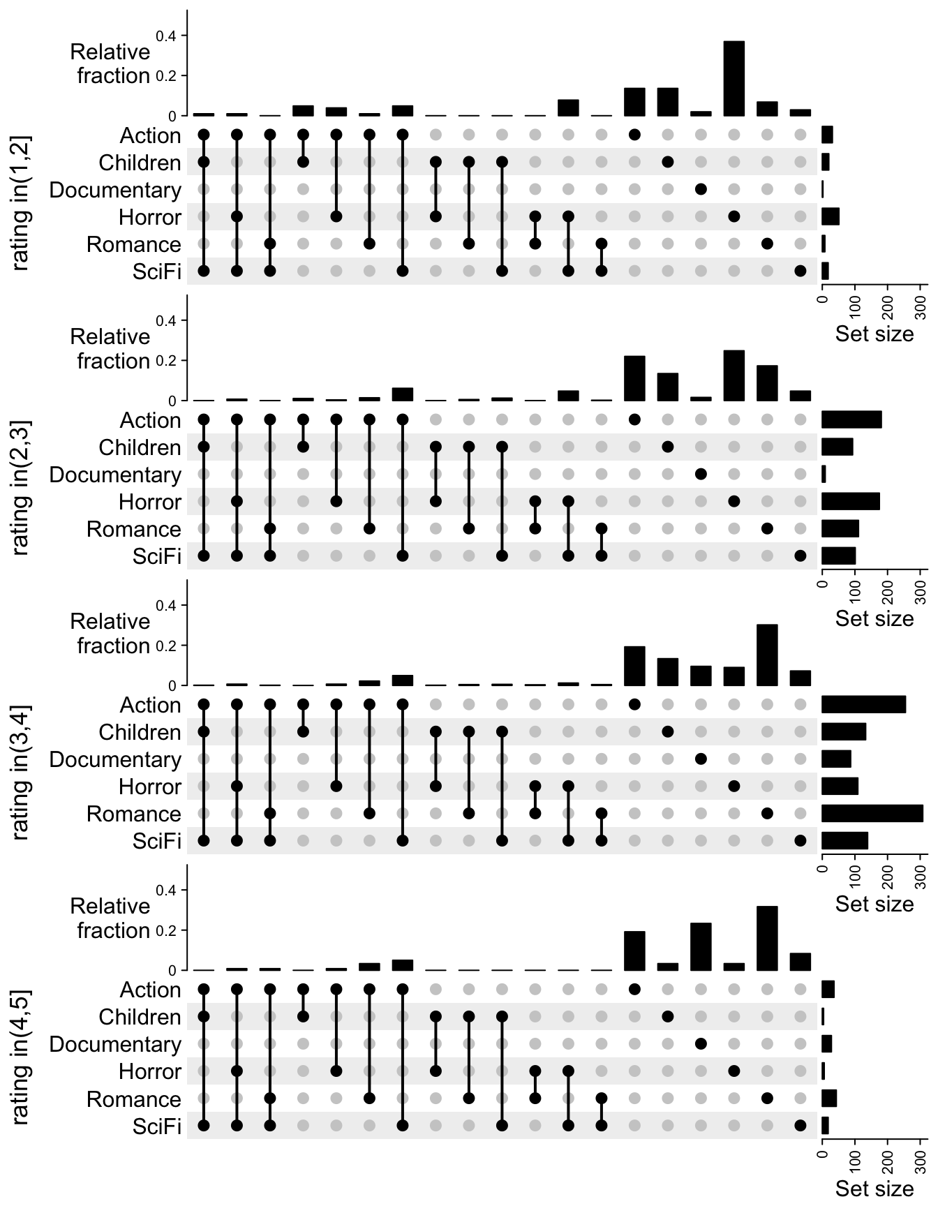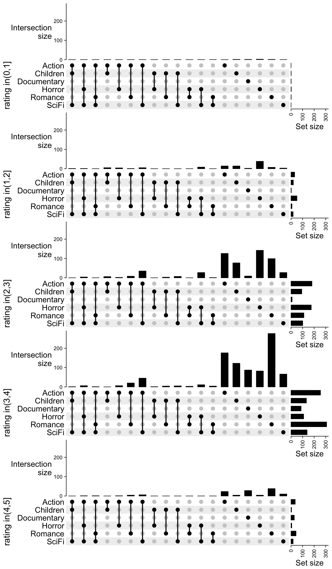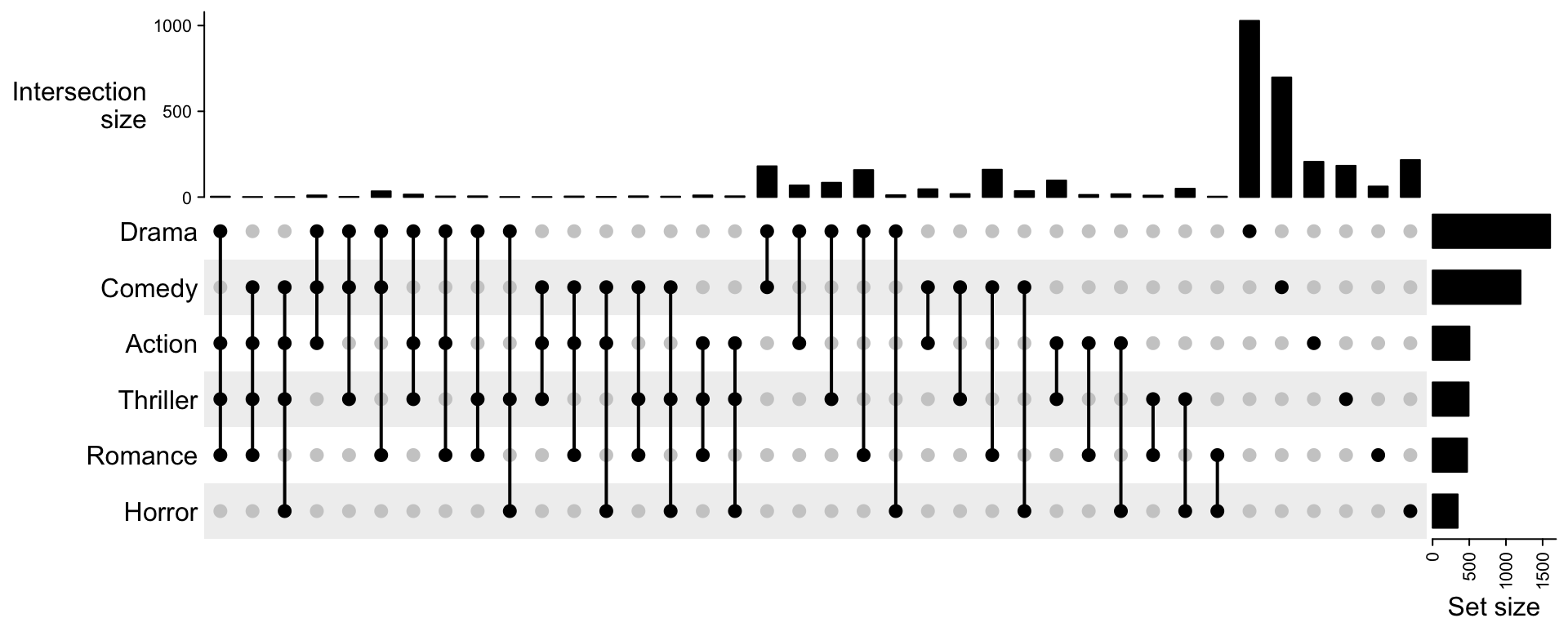 After comparing the five UpSet plots, we can see most of the movies are rated between 2 and 4. Horror movies tend to have lower ratings and romance movies tend to have higher ratings.