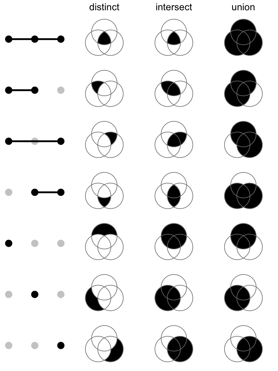 distinctmode: 1 means in that set and 0 means not in that set, then1 1 0means a set of elements both in set A and B, while not in C (setdiff(intersect(A, B), C)). Under this mode, the seven combination sets are the seven partitions in the Venn diagram and they are mutually exclusive.intersectmode: 1 means in that set and 0 is not taken into account, then,1 1 0means a set of elements in set A and B, and they can also in C or not in C (intersect(A, B)). Under this mode, the seven combination sets can overlap.union mode: 1 means in that set and 0 is not taken into account. When there are multiple 1, the relationship is OR. Then,1 1 0means a set of elements in set A or B, and they can also in C or not in C (union(A, B)). Under this mode, the seven combination sets can overlap.