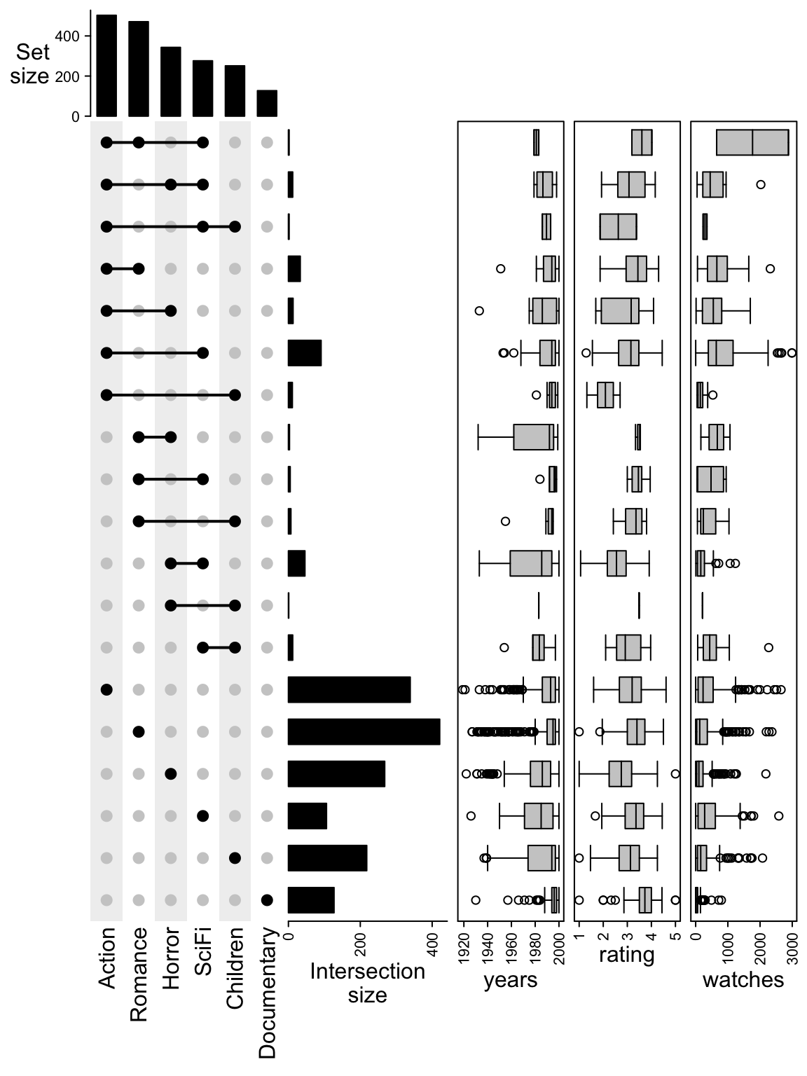 Finally we can add the statistics of years, ratings and number of watches for each combination set as boxplot annotations to the right of the UpSet plot.